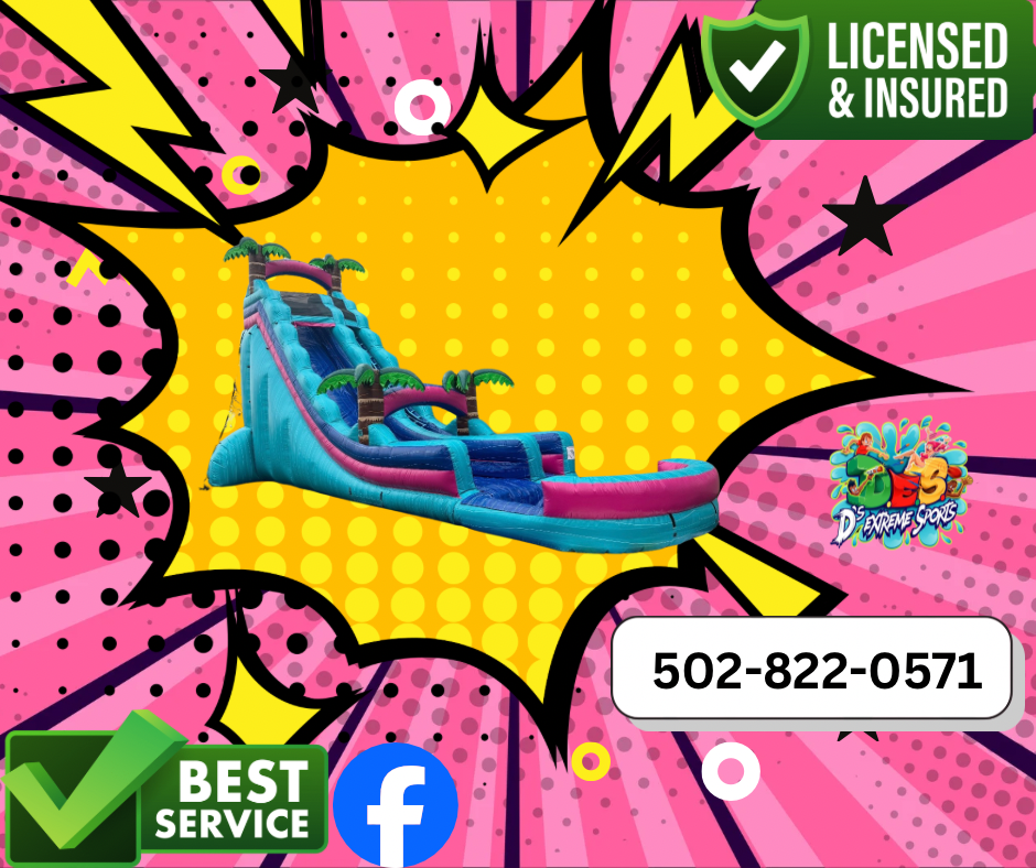 Are you looking for a Water Slide Rentals for your next party or celebration event! Look no further than D's Extreme Sports! We have the best selection of Water Slide Rentals around! Our selection of Water Slide Rentalsinflatables is extensive with a variety of bright and vibrant colors that are neutral friendly for ( Boys and Girls ) Best of all, All Water Slide Rentals are cleaned and sanitized after each rental, so you can be sure that your kids will always have a safe and fun experience with us. Our Water Slide Rentals really stand out and are the main attraction at party events such as birthday parties, school events, church festivals, and backyard events. Our #1 goal is safety for all our clients and we take great pride in offering high-grade selection of bounce houses for your celebrations or events. Whether you're renting an Obstacle Course , Dunk Tank Rentals , Extreme Sports Rentals ,Generator Rentals ,Tables & Chair Rentals, Water Slide Rentals We bring the fun to your doorstep! We provide delivery, set-up and pick-up to Meade County with quality inflatable rentals with excellent customer service! To make a reservation simply order online 24/7 from our website or call are office at 502-822-0571. We can be reached by email at dsextremesports@gmail.com or our Contact Ds Extreme Sports Inc. Follow us on Facebook as we update new inventory frequently!